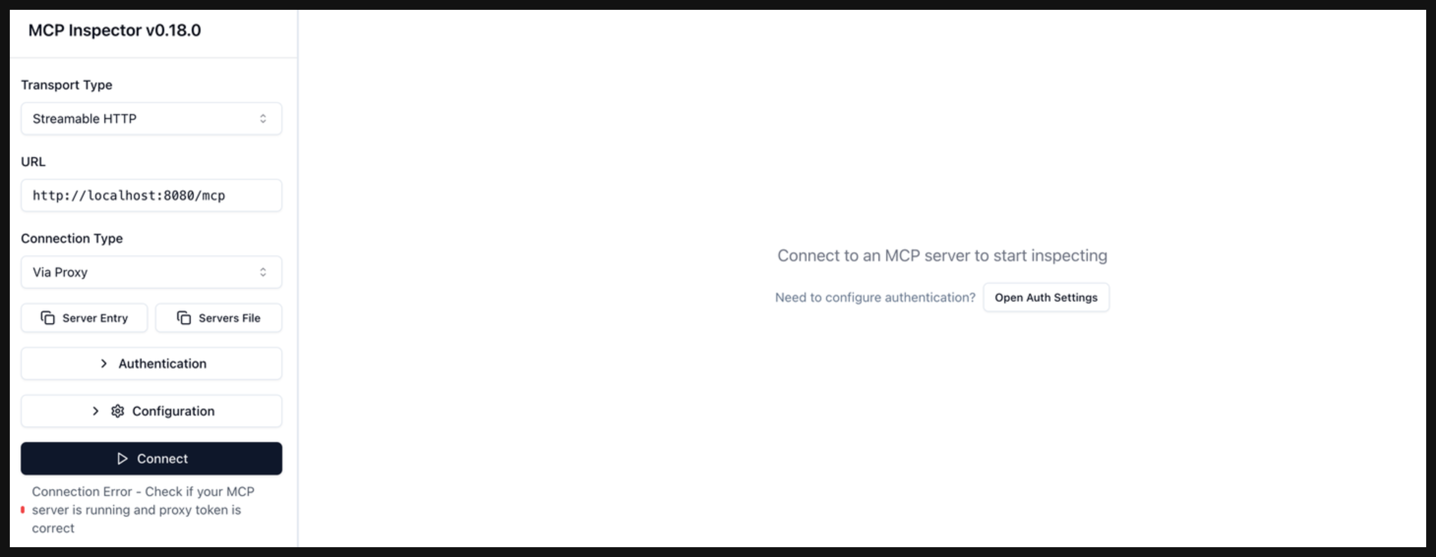 Verify that the connection fails, because authentication is required to access the MCP server.