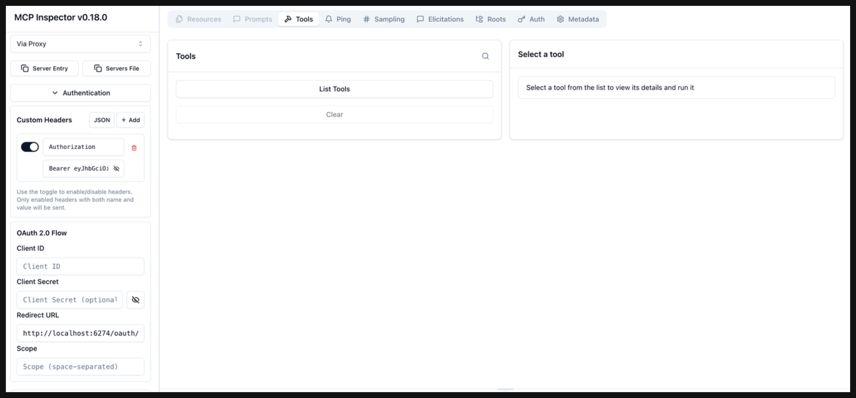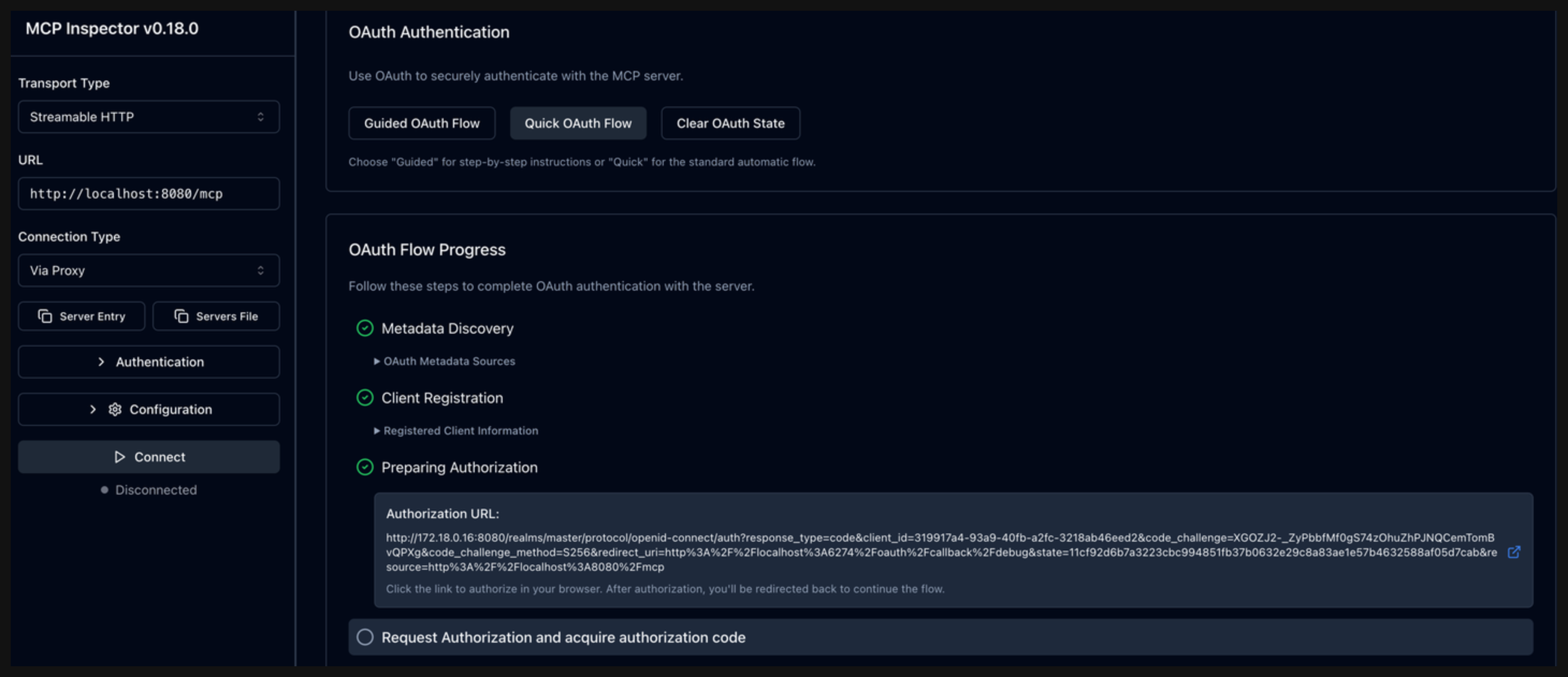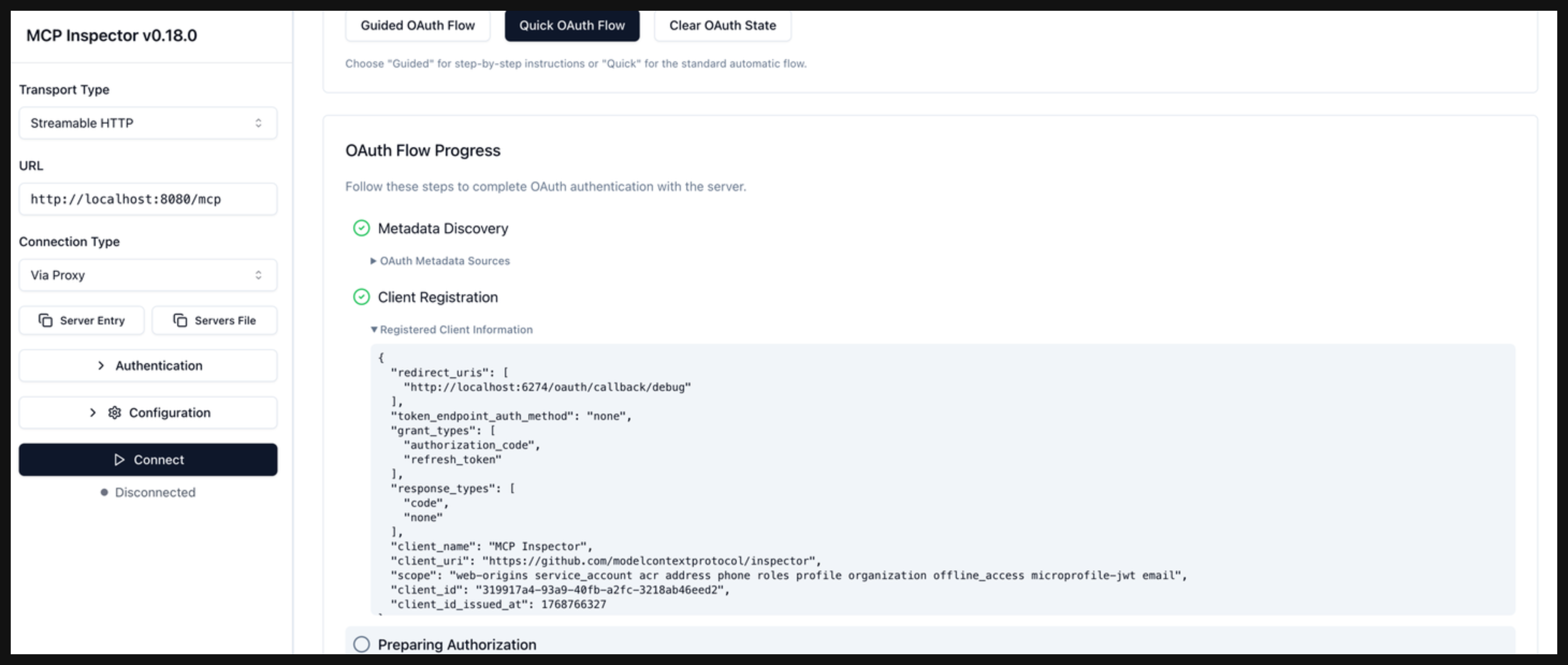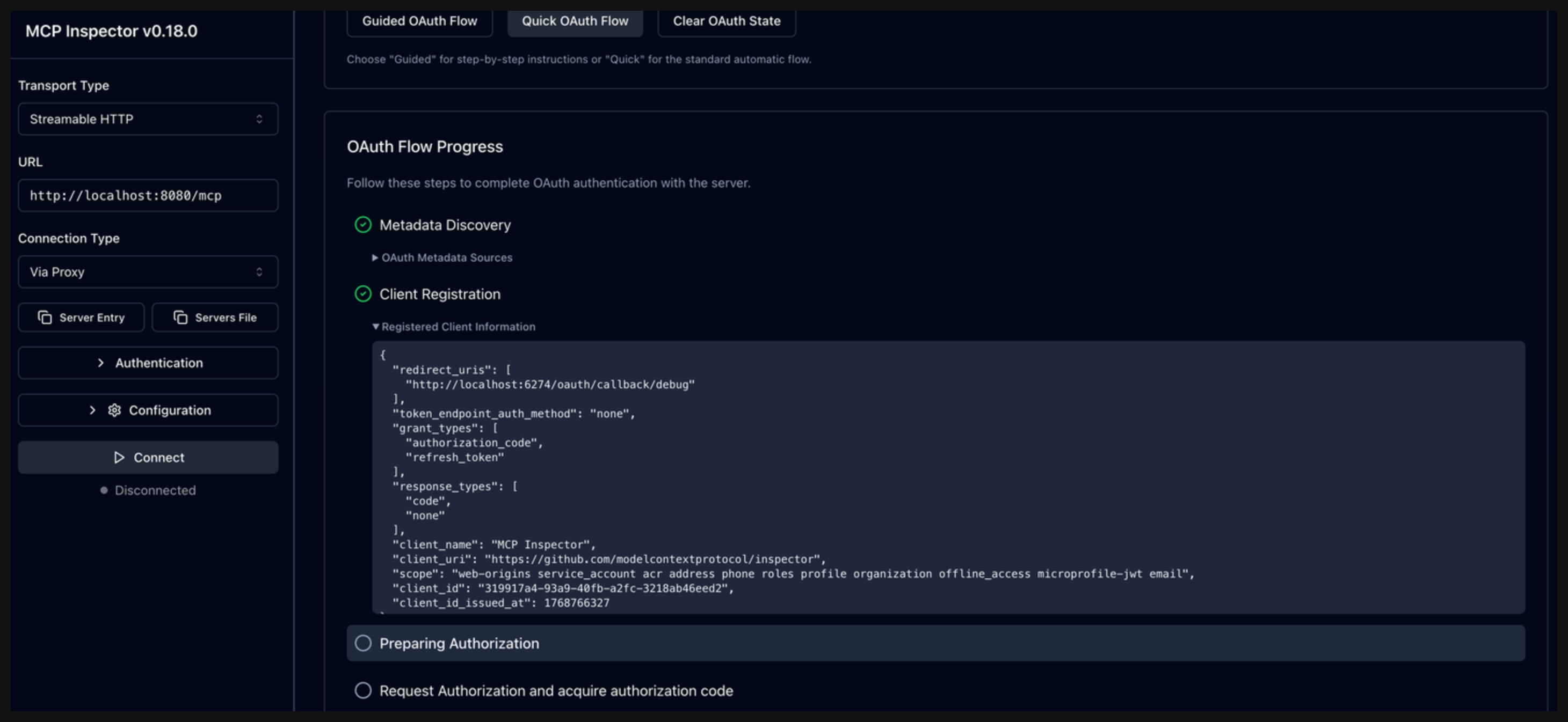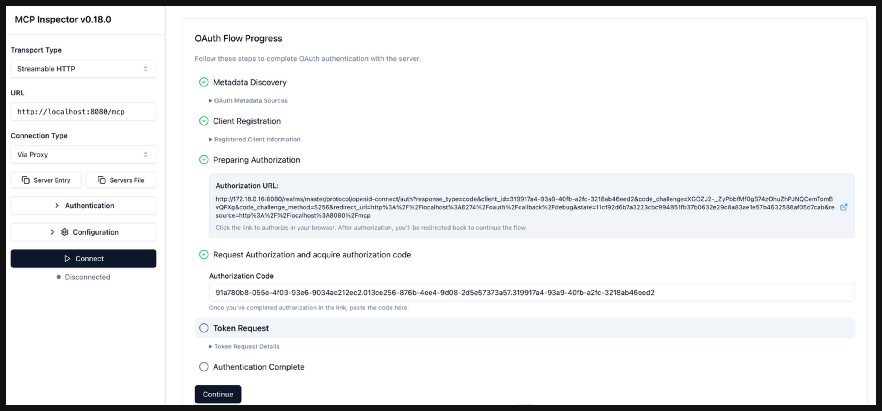 1. In the OAuth Flow Progress card, click Continue to start the Metadata Discovery phase. Verify that the step succeeds and that you see the authorization server metadata. The metadata include information about the location of the authorization server, supported scopes, and ways to provide the bearer token.